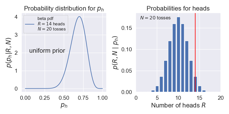 scipy.stats.beta.pdf(p_h,1+R,1+N-R). For \(N=20\), \(R=14\), this is shown on the left below.Now we can answer many questions, such as: what is the probability that \(p_h\) is between \(0.49\) and \(0.51\)? The answer comes from integrating our pdf over this interval (i.e., the area under the curve).