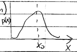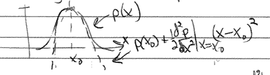 Note that \(\left.\frac{dL}{dx}\right|_{x_0 = 0}=0\), because \(L(x_0)\) is a maximum if \(p(x_0)\) is, and \(\left.\frac{d^2L}{dx^2}\right|_{x_0 = 0} < 0\). If we can neglect higher-order terms, then when we re-exponentiate,