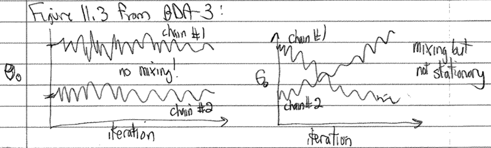 Monitor the convergence of individual sampling dimensions, as well as predicted quantities of interest, by comparing variations within and between the different sequences (chains). Here you are looking for stationarity (the running means are stable) and mixing (different sequences are sampling the same distribution). The Gelman-Rubin test (see below) is devised for this purpose. In the following schematic version of Figure 11.3 in BDA-3, we see on the left two chains that stay in separate regions of \(\theta_0\) (no mixing) while on the right there is mixing but neither chain shows a stationary distribution (the \(\theta_0\) distribution keeps changing with MC steps).