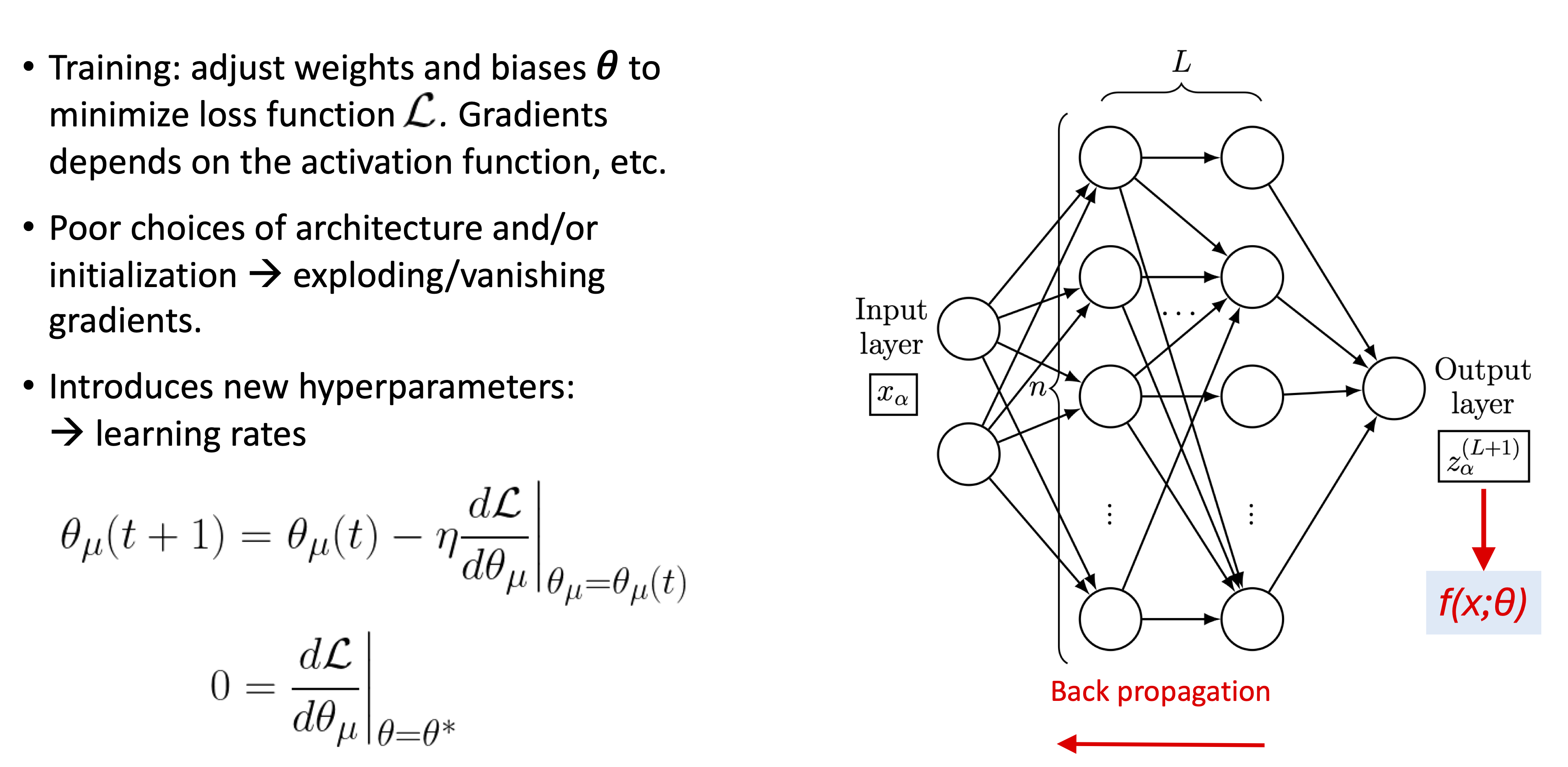 To achieve the desired functional relationship between \(x_{i,\alpha}\) and \(y_{j,\alpha}\), a neural network is trained by adjusting the weights and biases in each layer according to the gradients of the loss function \(\mathcal{L}\bigl(f(x,\pars),y\bigr)\). The loss function quantifies the difference between the network output \(f(x,\pars)\) and the output data \(y\), and the goal of training is to minimize \(\mathcal{L}\bigl(f(x,\pars),y\bigr)\). The gradients of \(\mathcal{L}\bigl(f(x,\pars),y\bigr)\) with respect to the network parameters \(\pars\) depend on the size of the output, as well as the architecture hyperparameters. It is known empirically that poor choices of architecture and/or initialization lead to exploding/vanishing gradients in the absence of adaptive learning algorithms, and this was problematic for training networks for many years.