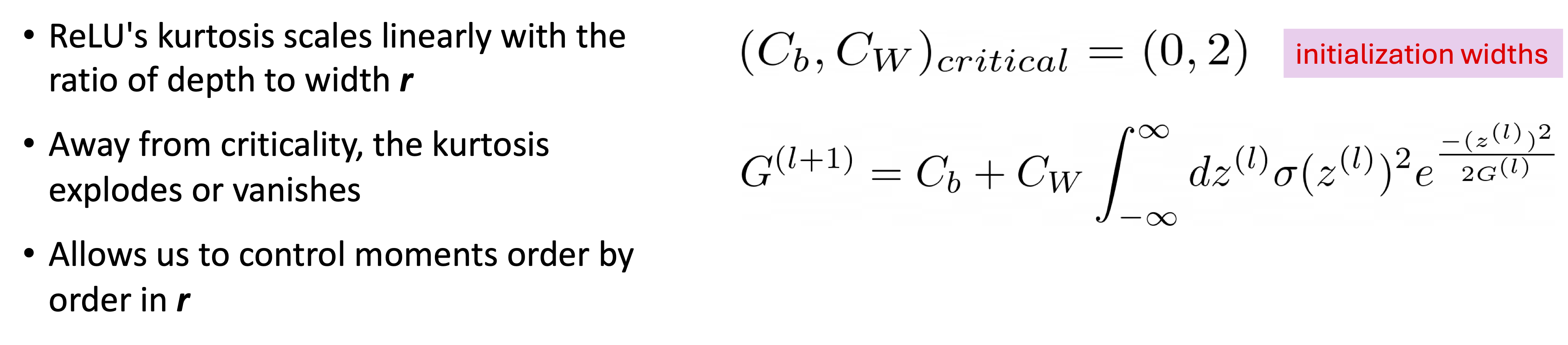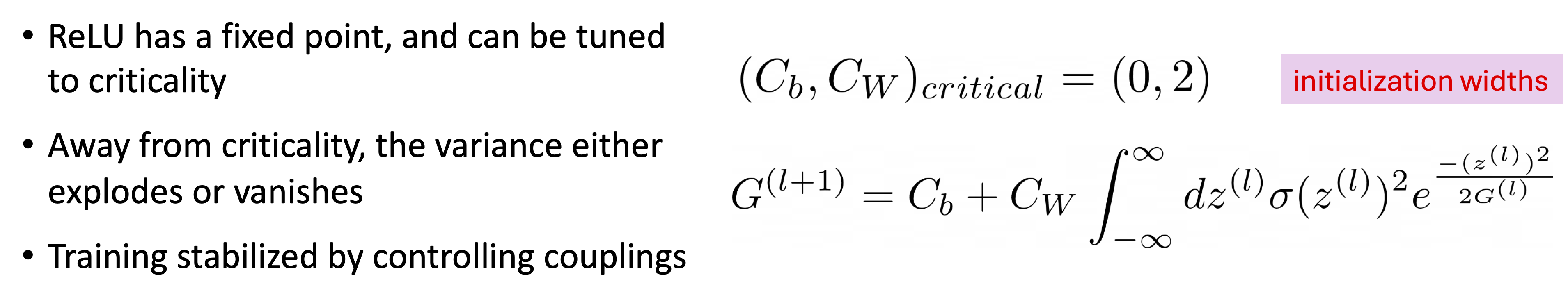 the success of certain initialization schemes (He initialization is reproduced by ReLU’s critical initialization).