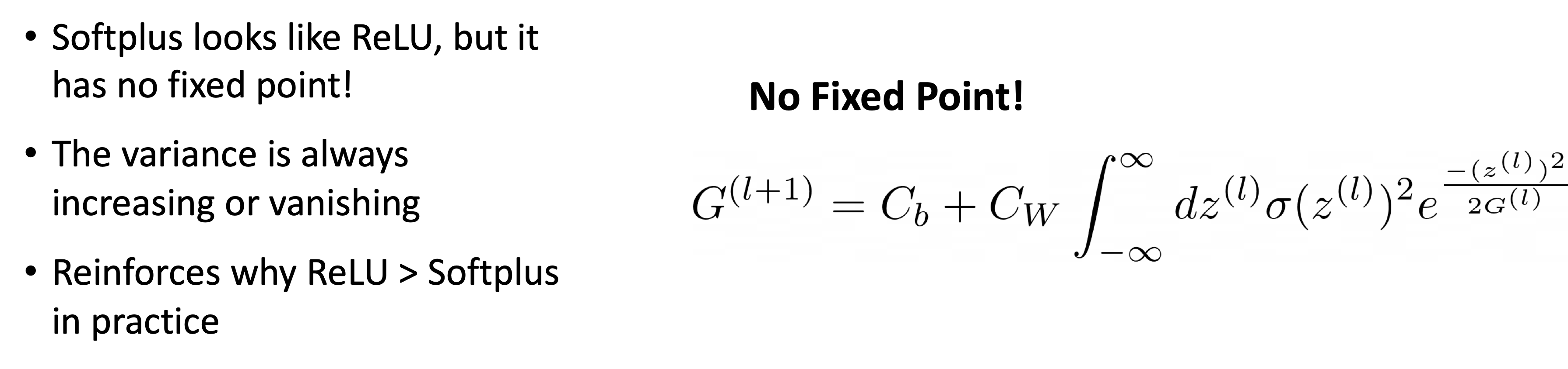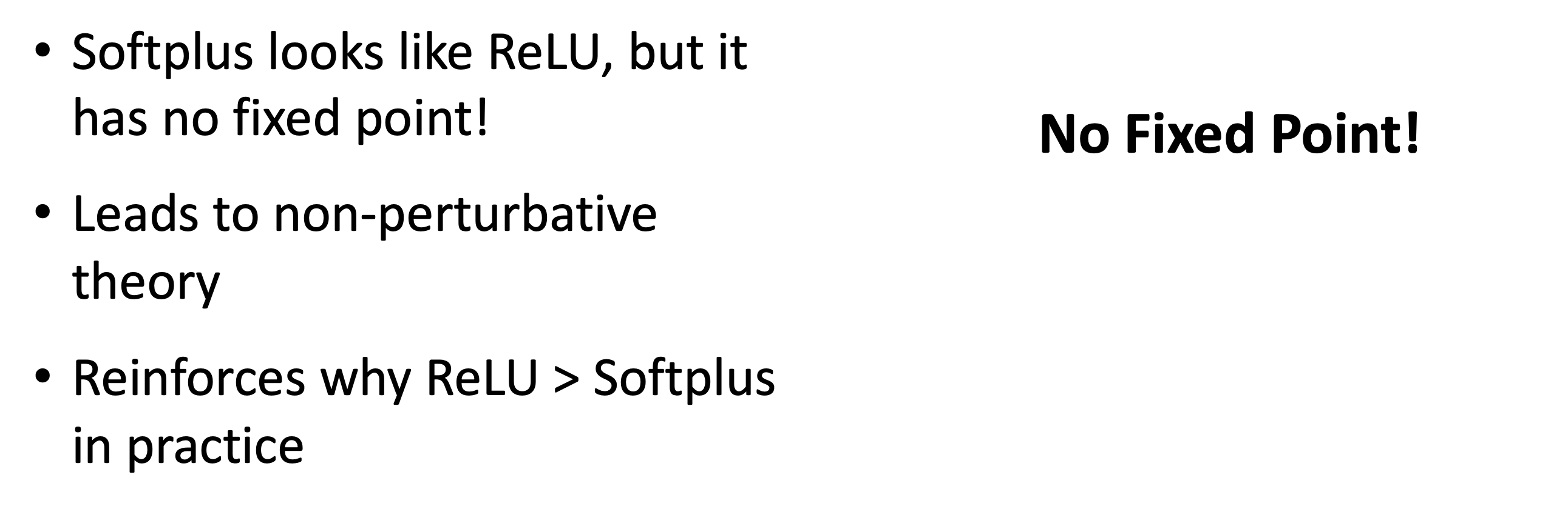 the success of activation functions such as ReLU or Tanh compared to Softplus or sigmoid;