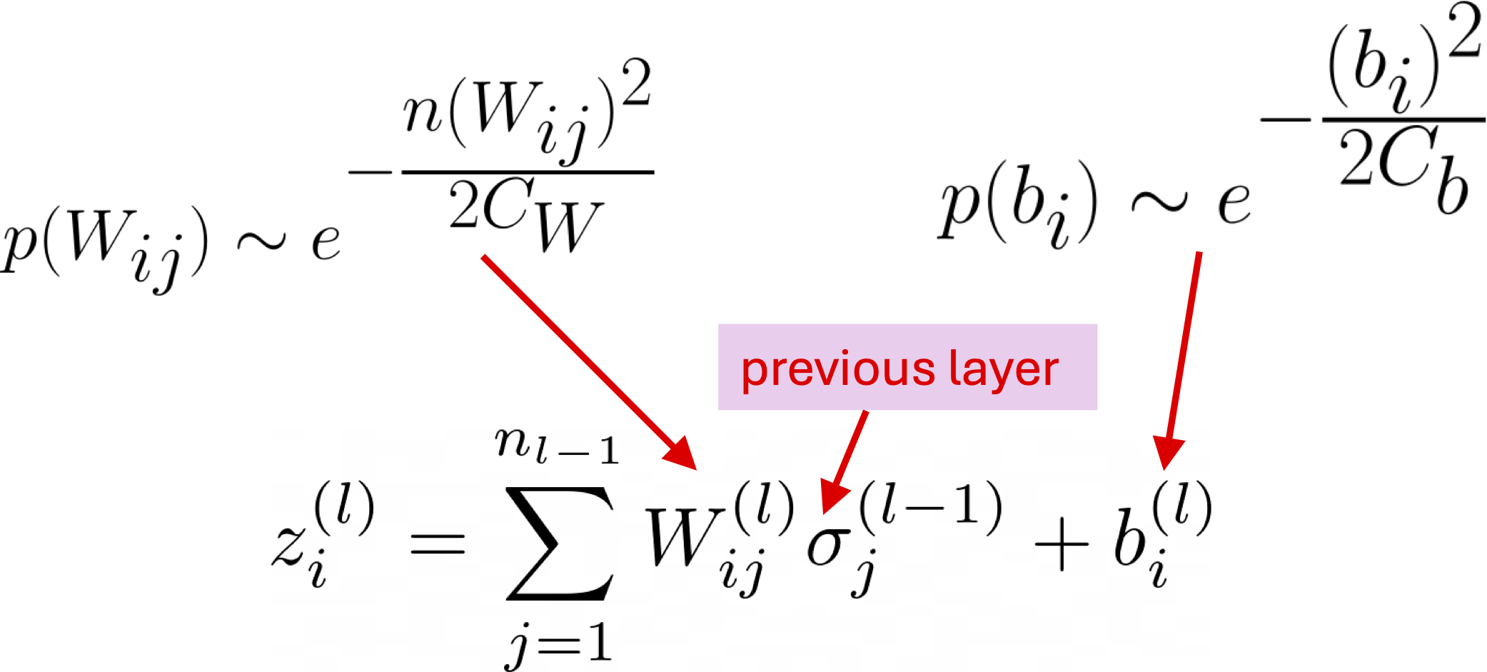 Neural network of given architecture induces a probability distribution of preactivations \(z\) at a given layer \(\ell\).