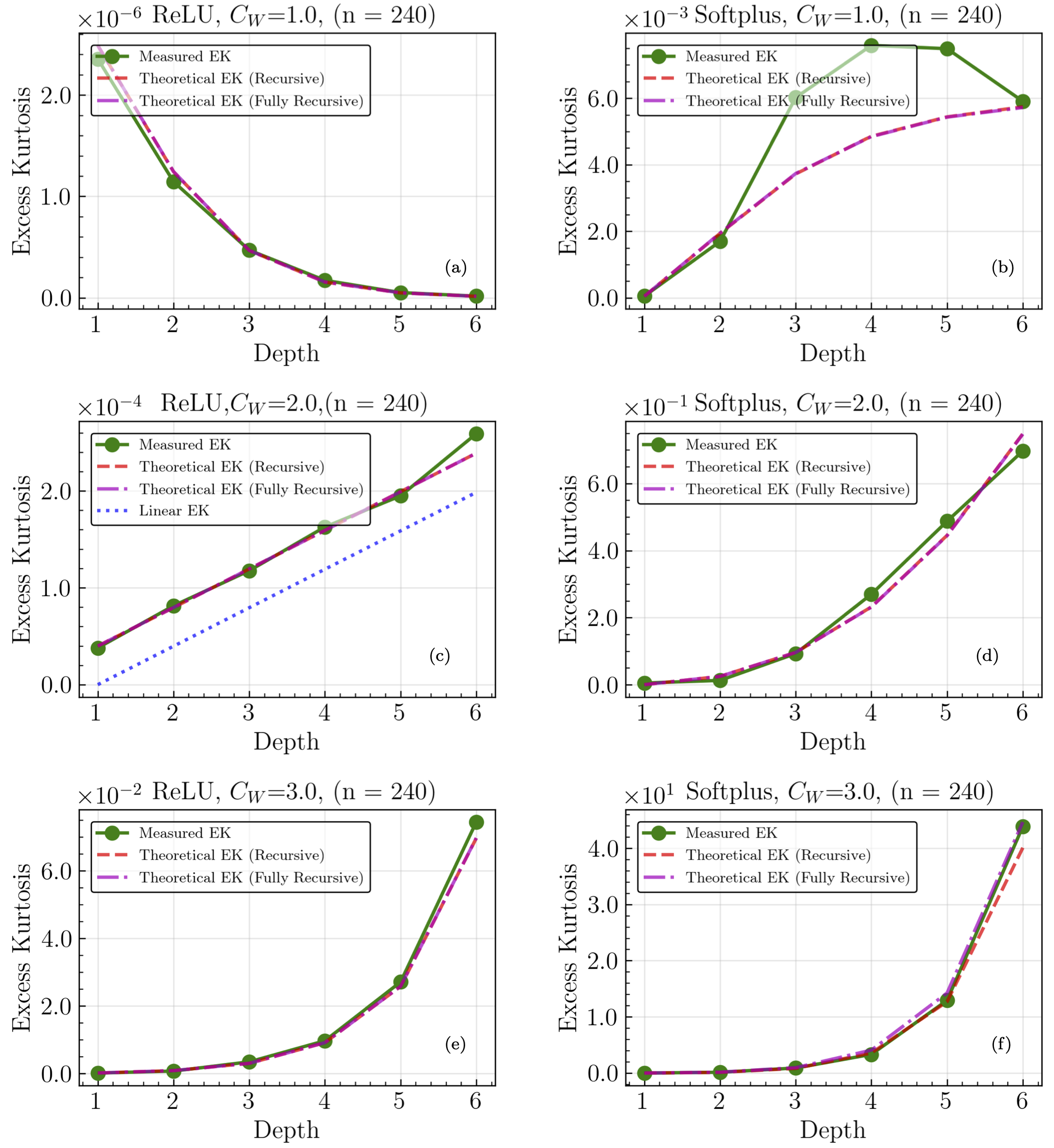 Fig. 26.9 The final-layer pre-training-output (unstandardized) excess kurtosis (abbreviated here as EK, and also known as the non-Gaussian 4-point correlations) as a function of neural network depth with a fixed width of 240. Results are given for a ReLU activation function tuned (a) below (\(C_W=1.0\), \(C_b=0.0\)), (c) at the critical point (\(C_W=2.0\), \(C_b=0.0\)) and (e) above (\(C_W=3.0\), \(C_b=0.0\)), and for a Softplus activation function with (b) lowest, (d) intermediate, and (f) highest initialization widths for the weights by using the same initialization hyperparameters as ReLU. The measured EK is plotted as a green line, a recursive calculation of EK using empirical values of the variance and initial EK is plotted as a dashed red line, and a recursive calculation using only theoretical values is plotted as a dashed pink line. An additional blue line is present in (e), representing an exact calculation of the critical EK without treating \(1/n\) terms as subleading. When critically tuned, ReLU networks’ EK behaves linearly with depth as predicted by ANNFT, demonstrating that the higher-order moments of the distribution are controlled by an expansion in \(r\). Non-critical distributions are seen to grow non-linearly with depth, reflecting that criticality allows for a perturbative ANNFT that lets deeper network network behavior to be analyzed.#