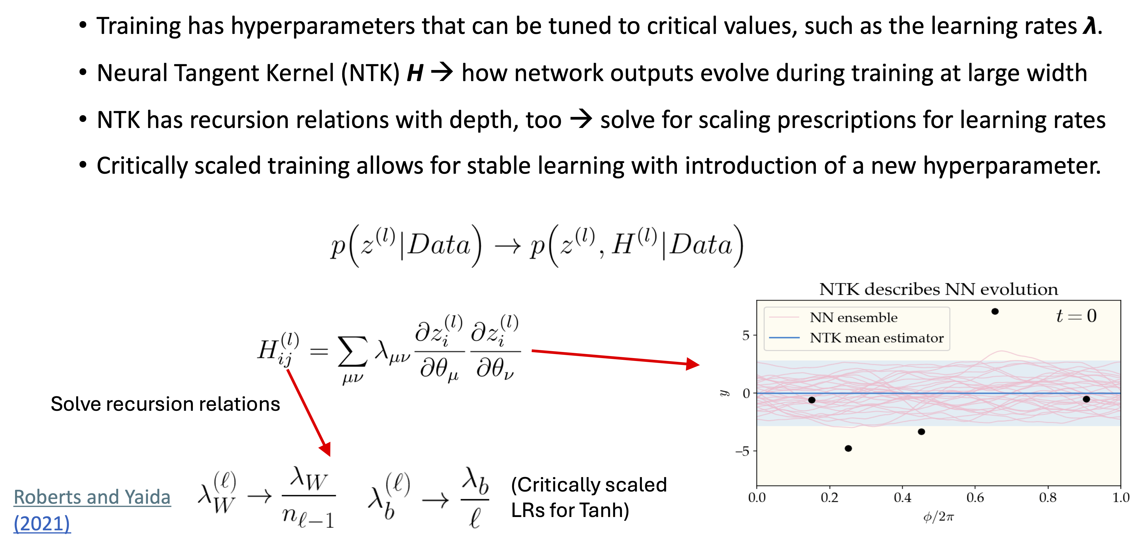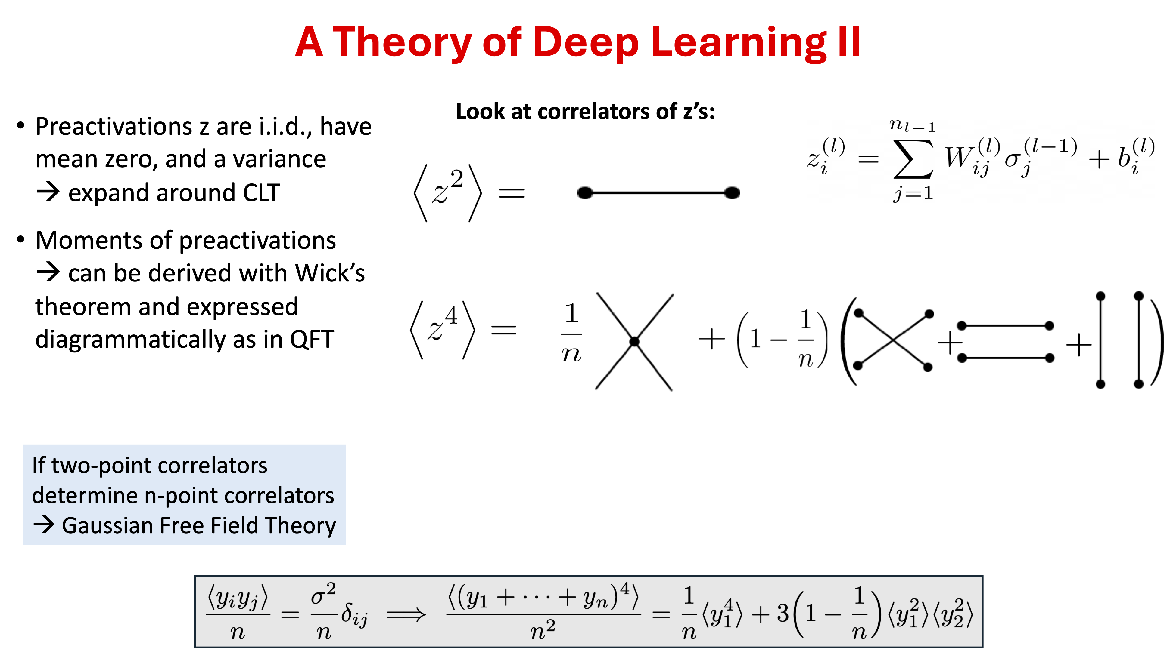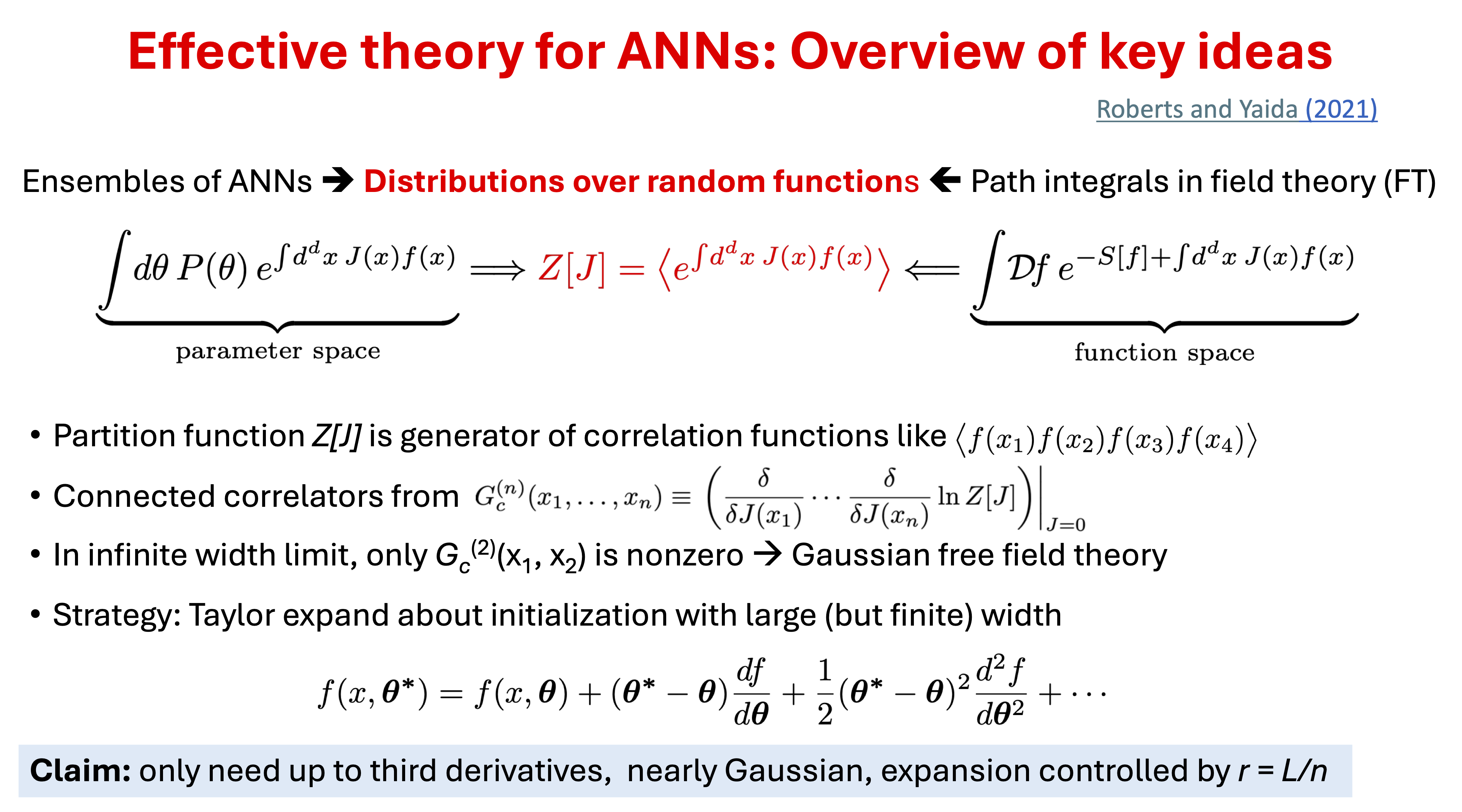 where the input vector is \(x\) (we don’t use boldface or arrows for this vector) and \(\pars\) is the collective vector of all the parameters (weights and biases). In order to understand this we need a framework and an approximation scheme. Effective (field) theory and large-width limit of the network is a compelling path.