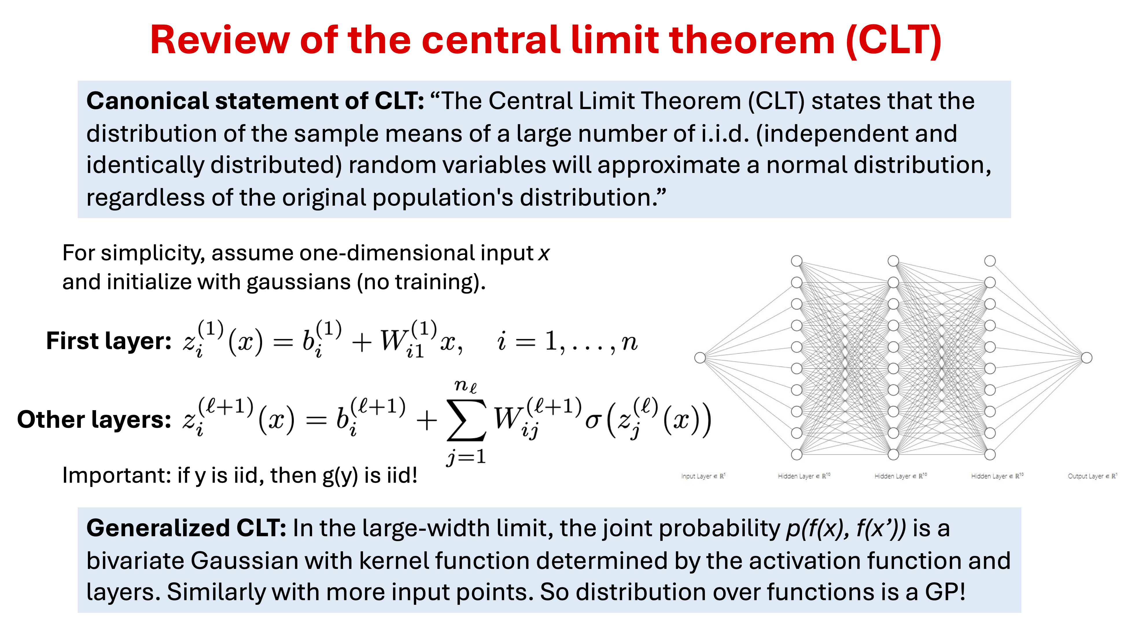 The Central Limit Theorem kicks in as the width \(n\) goes to infinity, so these distributions should become (correlated) Gaussians, i.e., Gaussian processes.