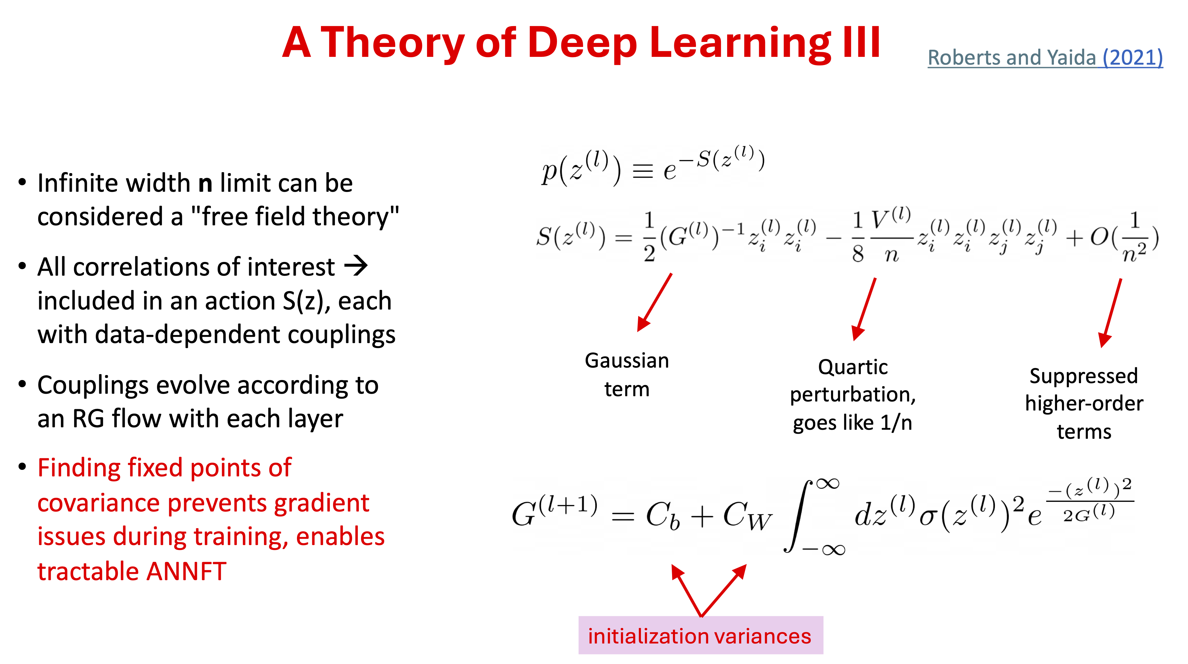 This infinite width limit by itself is not an accurate model for actual deep-learning networks, because it is too limited in what it can learn from the data. But there is a way to describe finite-width effects systematically using the correspondence with field theories (statistical or quantum). In this correspondence, the infinite-width limit is associated with free (non-interacting) theories that can be corrected perturbatively for finite width as weakly interacting theories. The concepts of effective (field) theories carry over as well, as the information propagation through the layers of a deep neural network can be understood in terms of a renormalization group (RG) flow. A fixed point analysis motivates strategies for tuning the network to criticality, which deals with gradient problems (blowing up and going to zero).