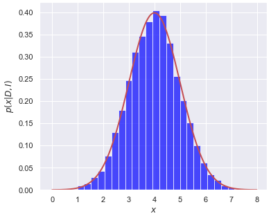 and we’ll imagine \(p(x|D,I)\) is like the red lines in the figures here.