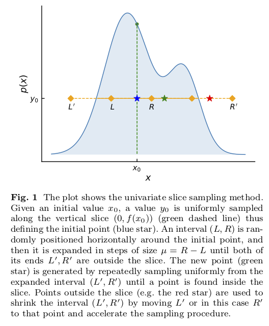 The blue star comes from uniformly sampling in \(y\) at the initial point \(x_0\) to identify \(y_0\). The “slice” is the set of \(x\) such that \(y_0 < f(x)\). In the figure the interval initially from \(L\) to \(R\) is expanded to \(L'\) to \(R'\), which includes the full slice. When the final interval is found, a new \(x_1\) is drawn uniformly from the intersection of the interval and the slice.