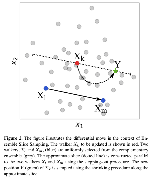 Figure Fig. 20.3 illustrates how the ensemble of walkers is used to do what is called a “differential move”. There are several choices for moves, including a global one that is effective for multi-modal distributions.